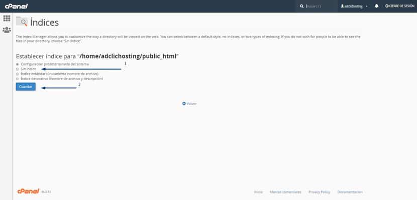 Dentro de las opciones mostradas para tildar en la opción de Índices cPanel, seleccionaremos la opción «Sin Índice» y seguidamente clic en «Guardar» para efectuar los cambios.